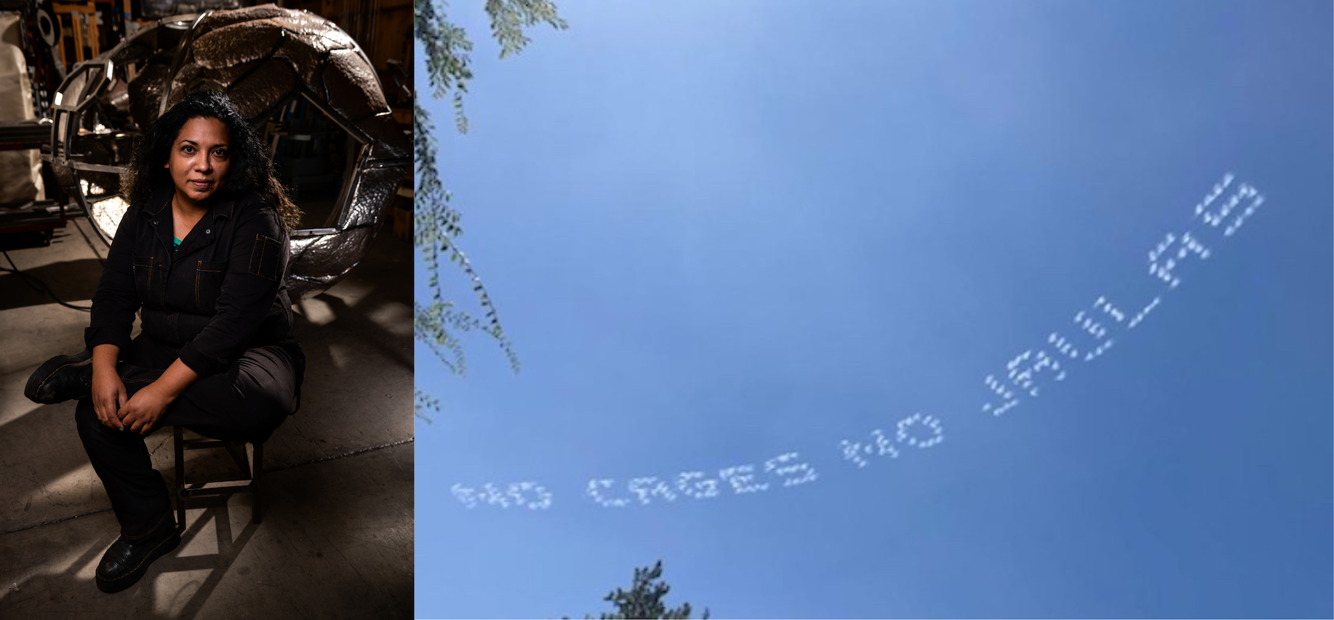 Right image credit: Beatriz Cortez, Photo documentation of No Cages, No Jaulas, 2020. Sky-typing over Los Angeles Immigration Court. Courtesy of the artist and In Plain Sight, photo by Dee Gonzalez.